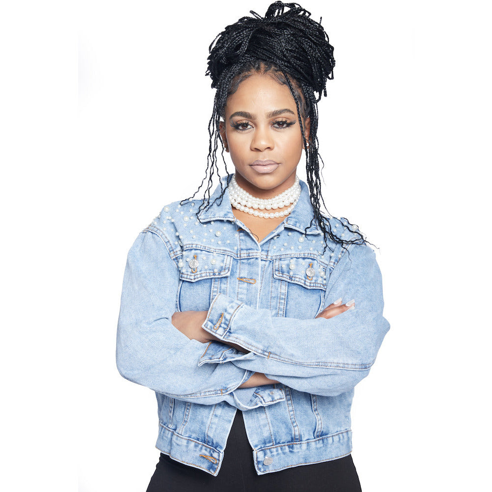 This stylish denim jacket is decorated with pearls and displays "Pretty Girl™" on the back.
